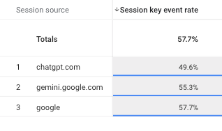 Likelihood to convert: Google also claims in the keynote that clicks coming from AI overviews are "higher quality," which I assume means more likely to convert. So, I looked in GA4 at the Session key event rate for referrals from ChatGPT vs from overall. On our website, traffic referred from ChatGPT and Gemini is not more likely to convert compared to traffic from organic Google Search.