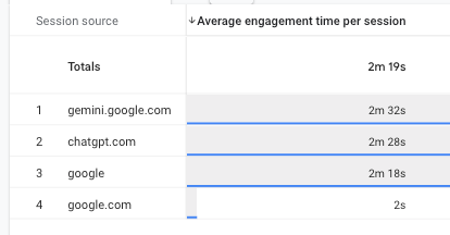 Time on page: Yes. In our website data, it appears that ChatGPT and Gemini referred traffic spends more time on page than Google-referred traffic, on average. aI looked into that question for our website, which is a SaaS product. It is true that users coming from gemini.google.com and from chatGPT.com spend on average 10 seconds more on our website, about 10% more than the average session.