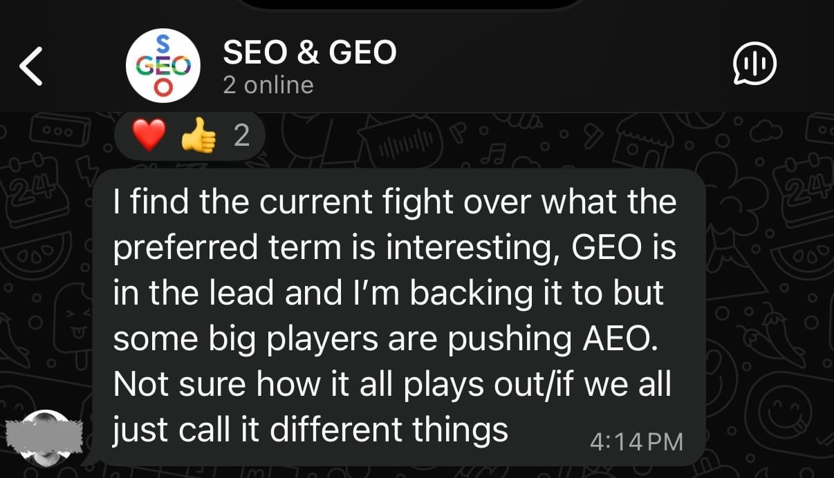tl;dr GEO, or Generative Engine Optimization, is my preferred term for the study and discipline of making a brand, business, or product show up in LLM results.