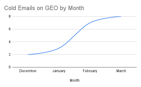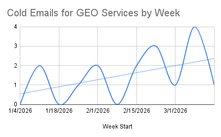 From December 2025 through mid-March 2026, I tracked 18 cold outreach emails to my main email address explicitly pitching GEO services. I excluded any newsletters, substacks, and product marketing emails and only counted sales emails sent directly to my work inbox. It's a modest number, but the growth rate is the story.